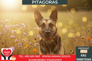 Pitagoras przypomina owczarka belgijskiego – jest inteligentny, pojętny i bardzo szybko się uczy. Uwielbia kontakt z człowiekiem, chętnie współpracuje i z radością uczestniczy w spacerach. Akceptuje inne psy, dzięki czemu może zamieszkać również w domu, gdzie czeka już psie towarzystwo.