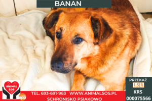 Banan to około 1,5-roczny piesek, który został znaleziony na wysypisku śmieci. Całe swoje dotychczasowe życie spędził z dala od ludzi – nie znał człowieka, domu ani normalnego świata. To, co dla wielu psów jest oczywiste, dla Bananka jest zupełnie nowe.