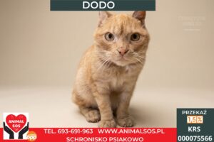 Poznajcie Dodo – około rocznego kocurka o spokojnym i niezwykle wrażliwym usposobieniu. Na pierwszy rzut oka Dodo może wydawać się nieco nieśmiały, ale to tylko pozory. To po prostu kotek, który bacznie obserwuje świat i potrzebuje chwili, by poczuć się w pełni bezpiecznie i zaufać nowemu człowiekowi.