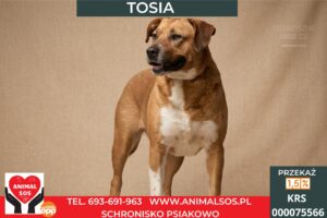 To sunia średniej wielkości o niezwykle przyjaznym usposobieniu. Każdy dzień traktuje jak nową, ekscytującą przygodę. Uwielbia ruch, bieganie i wspólne odkrywanie świata, a jej entuzjazm jest po prostu zaraźliwy. Mimo swojej energii, Tosia posiada też drugą, niezwykle subtelną stronę – jest bardzo łagodna, empatyczna i potrafi całym ciałem wtulić się w człowieka, szukając bliskości.
