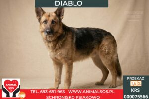 Poznajcie Diablo – silnego i pięknego psa w typie owczarka niemieckiego, urodzonego około 2024 roku. Diablo to dwuletni chłopak, który jest w najlepszym wieku, by stać się Twoim najwierniejszym towarzyszem i stróżem domowego ogniska.