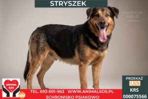 Poznajcie Stryszka – wyjątkowego psa urodzonego w 2021 roku, który waży solidne 26 kg. Stryszek to prawdziwa dusza towarzystwa w pięknym, futrzanym kombinezonie! Choć los nie zawsze go rozpieszczał, on postanowił brać z życia to, co najlepsze – jego radosne spojrzenie i niespożyta energia sprawiają, że uśmiech sam pojawia się na twarzy.